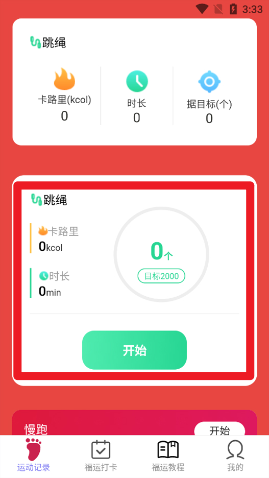 2、运动记录目标设定,用户点击开始后即可记录跳绳数量、卡路里和时长,提升锻炼效果。