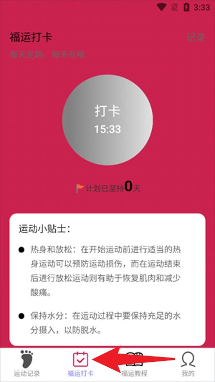 4、进入【福运打卡】界面,用户可每日签到打卡,配合运动小贴士,科学运动并保持健康习惯。