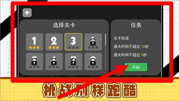 1.关卡选择:关卡界面提供多种挑战任务,玩家可根据完成条件解锁更多星级并点击开始按钮开启新的冒险之旅。