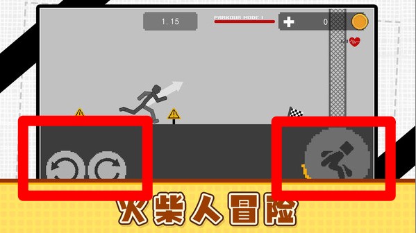 2.操作按钮:屏幕下方显示前进与跳跃按钮,玩家需灵活使用它们控制火柴人角色完成跑酷与躲避障碍的动作。