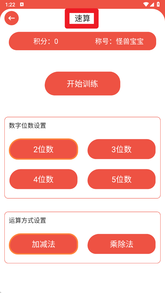 1、速算页面提供数字位数和运算方式设置,用户可选择加减法或乘除法,开始训练后提升心算能力并积累积分。