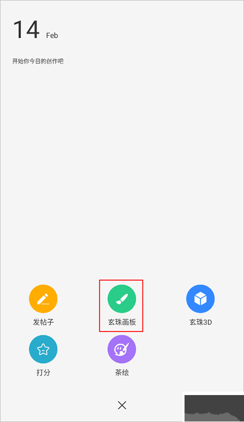 1、启动画吧应用,轻触下方中央的“手指”图案,在弹出选项中选取“玄珠画板”。