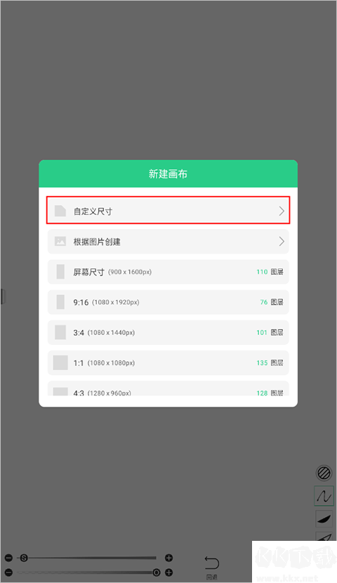 3、界面将显现新画布设置窗口,点选“自定义尺寸”就能随意设定画布规格了。
