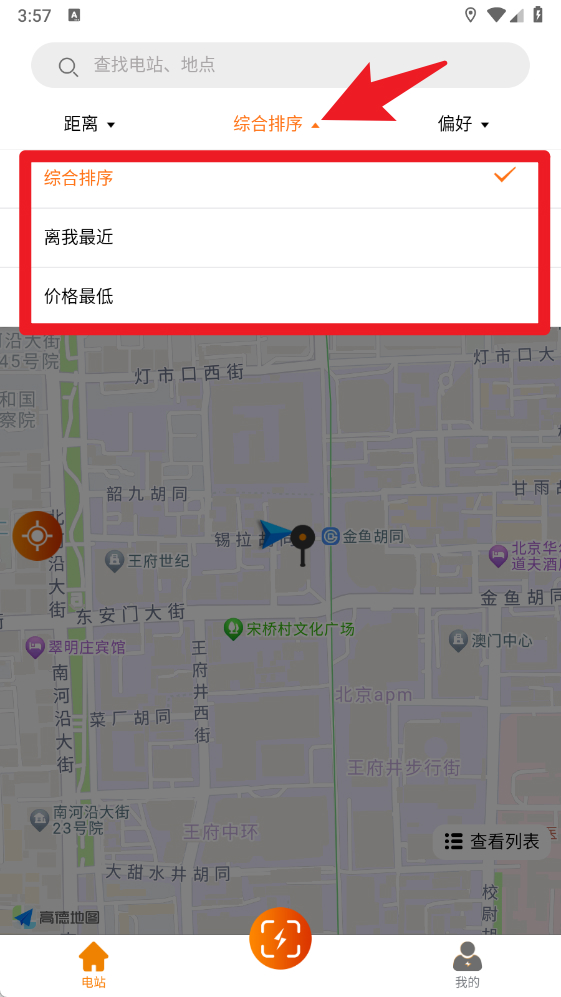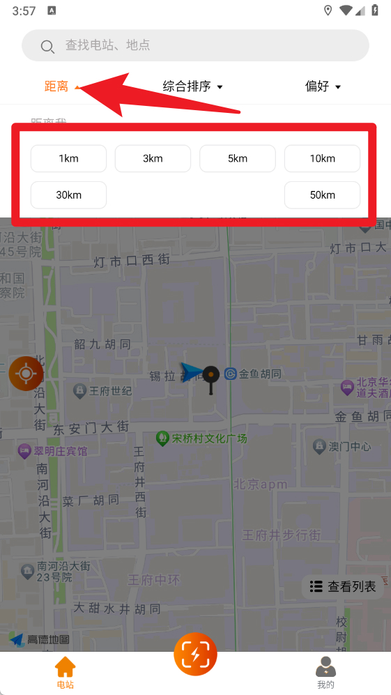 3、点击“距离”选项,可根据1km、3km、5km等范围筛选充电站,更高效地找到附近电桩。