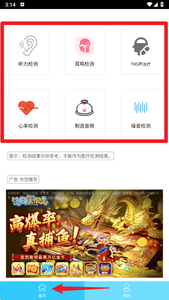 2、首页功能区提供听力检测、耳鸣检测、TRS声治疗、心率检测、制造音频和噪音检测等多种检测工具,满足多样化健康监测需求。