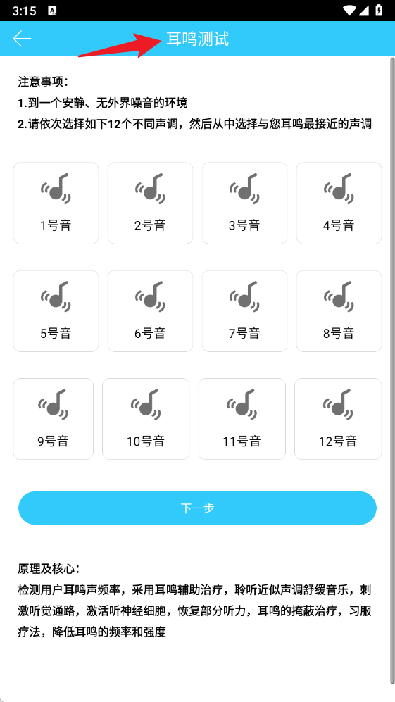 4、耳鸣测试功能提供12种不同声调,用户可选择最接近耳鸣的声音,帮助进行耳鸣辅助治疗和诊断。