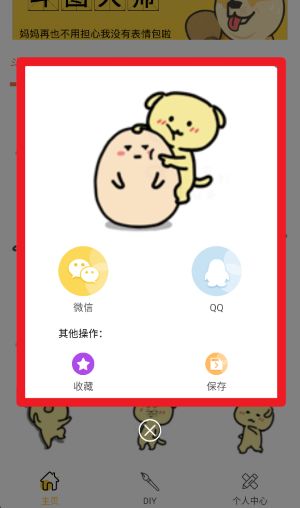 3、点击任意一个表情包图片,即可打开弹窗,在其中选择分享到微信、QQ,或者点击下方按钮进行收藏或保存至本地。