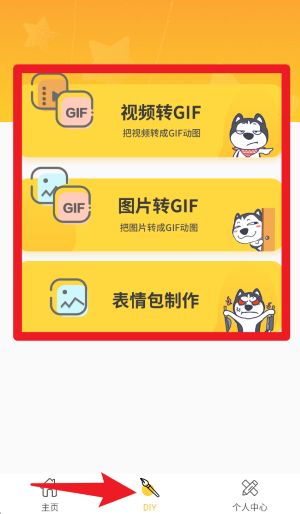 4、点击底部导航栏“DIY”进入创作中心,可选择“视频转GIF”、“图片转GIF”或“表情包制作”进行个性化创作。