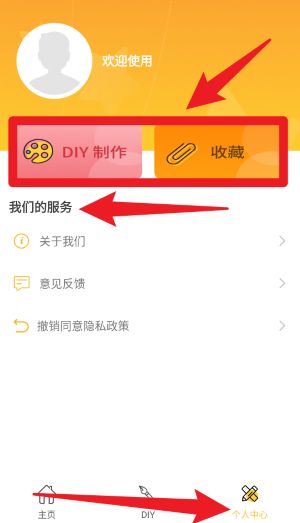 5、进入“个人中心”后可查看“DIY制作”和“收藏”内容,同时也能提交意见反馈,查看关于我们或撤销隐私政策。