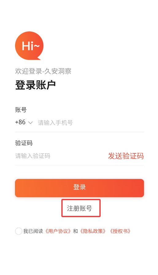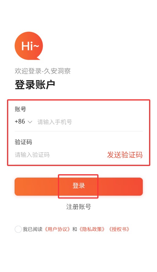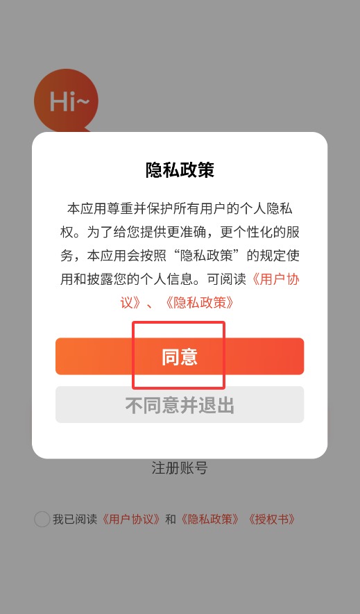 1、首次启动APP会弹出用户协议,点击"同意"后进入登录页面。