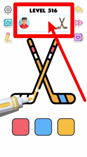 2.关卡显示区域清晰标注当前等级与任务图案,例如冰球棍造型,玩家需根据提示完成对应的上色挑战内容。
