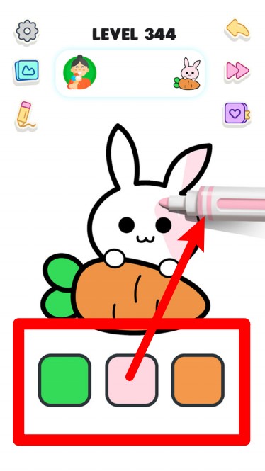 3.上色界面提供多种颜色选项,玩家可自由选择为小兔子和胡萝卜进行涂色,让画面更加生动可爱充满创作乐趣。