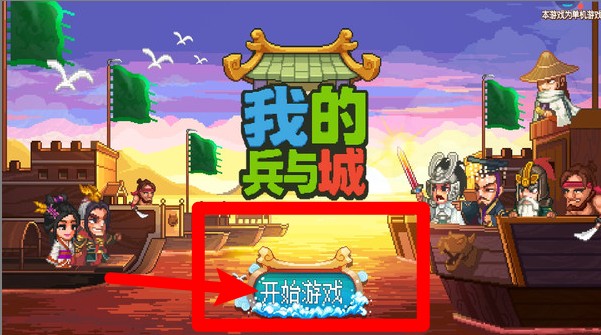 1.开始界面以像素风格呈现恢弘三国场景,点击开始游戏按钮即可进入冒险,体验从建城到征战的完整成长与争霸历程。