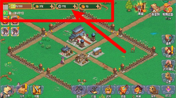 3.界面上方显示了城池的关键资源信息,包括人口数量粮食储备木材石料与金币,玩家需要随时关注并合理分配使用。