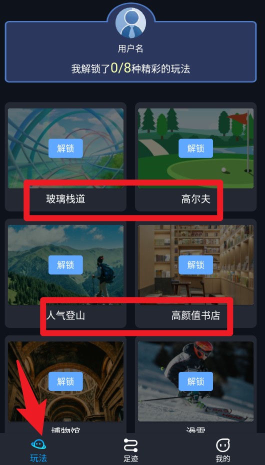 1、在“玩法”页面中,用户可以解锁多种玩法,例如玻璃栈道、高尔夫、登山或高颜值书店,每次解锁都会显示进度累计,提升探索体验。