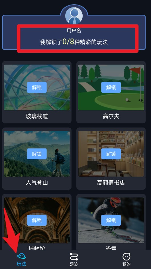 2、顶部会显示解锁玩法的进度,例如“我解锁了0/8种精彩的玩法”,方便用户随时掌握当前完成度和后续目标。