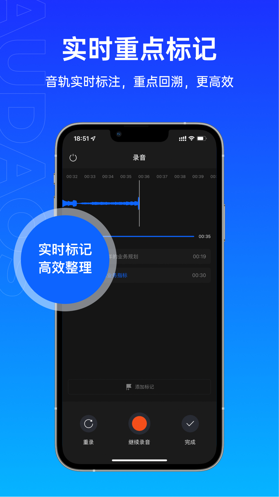 1、在录音界面,用户可以点击“继续录音”按钮延长录制时间,也可以选择“重录”或“完成”操作,使录音保存与编辑更加灵活和高效。