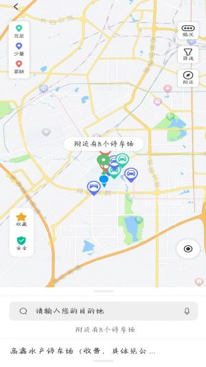 4、点击去停车功能,可实时查看附近停车场的分布与车位情况,帮助用户快速找到停车位置。