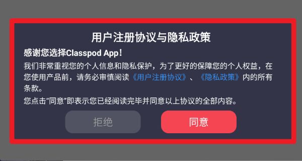 1、首次打开Classpod时会弹出用户注册协议与隐私政策窗口,阅读完毕后请点击“同意”按钮以继续使用软件。