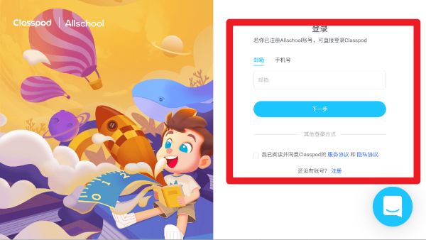 2、进入登录界面后,可选择使用邮箱或手机号登录,首次使用请先注册Allschool账户后方可进入平台。