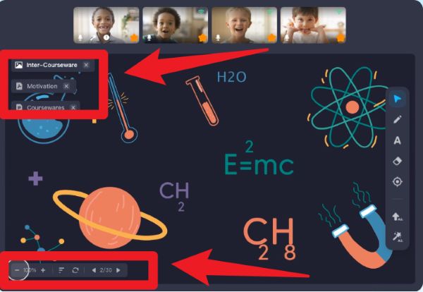 5、在课堂白板区,教师可切换课件、调节比例、翻页操作等,左上角可管理打开的多个教学课件标签。