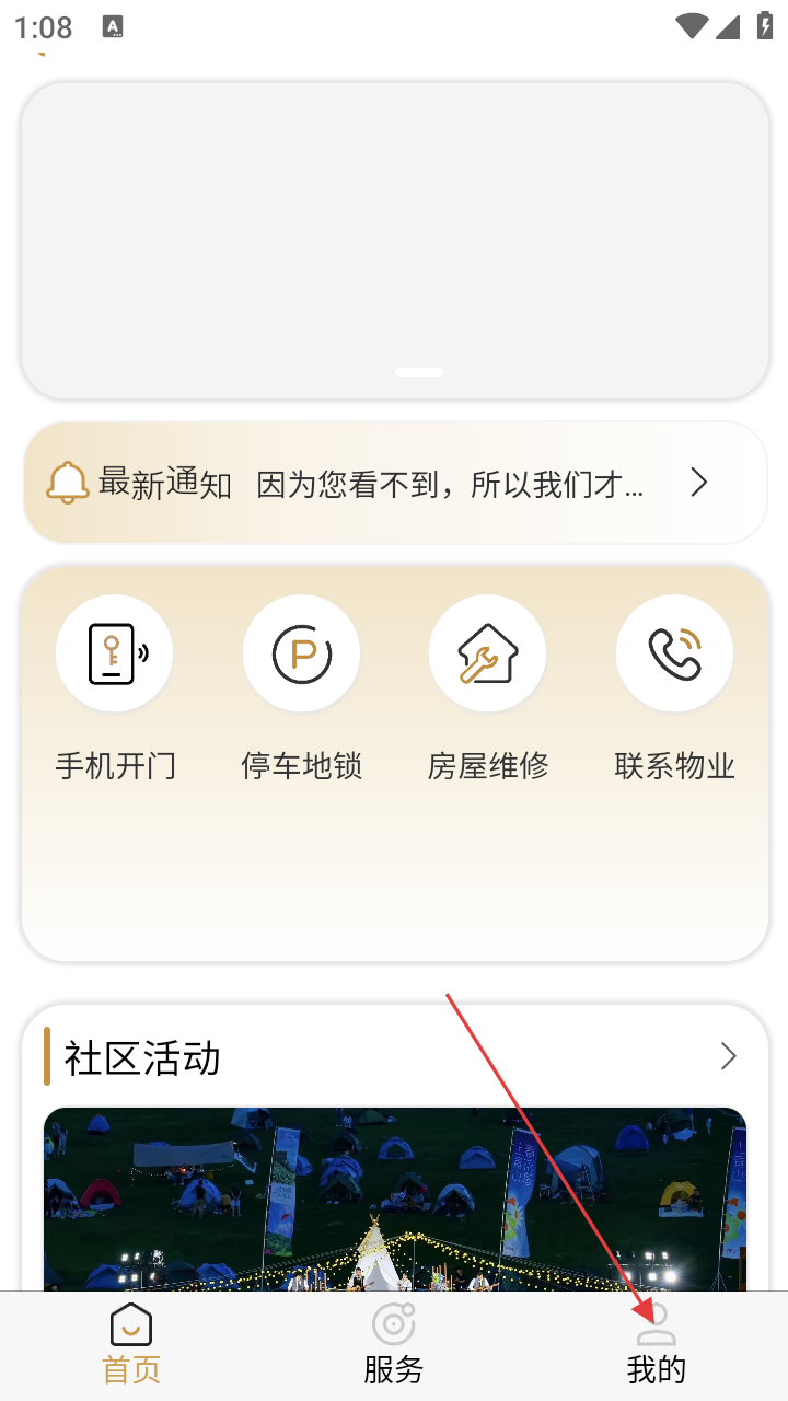 1、打开大华荟生活,首页有【手机开门】【停车地锁】等功能按钮,还能查看社区活动,点击右下角【我的】进入个人页面。