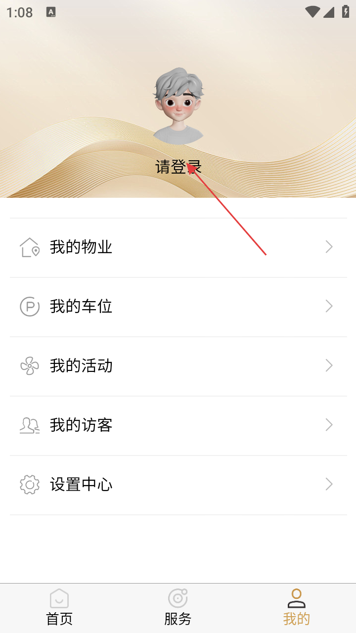 2、在“我的”页面,显示【请登录】,下方有【我的物业】【我的车位】等选项,点击【请登录】进入登录界面。