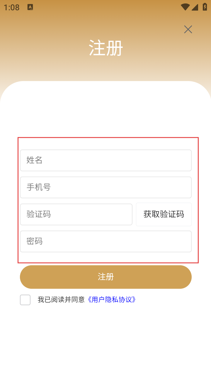 4、在注册页面,依次填写姓名、手机号,获取并填写验证码,设置密码,勾选同意《用户隐私协议》后,点击【注册】完成账号注册。