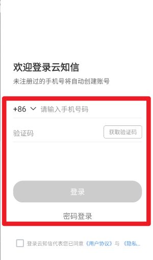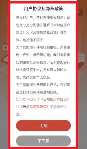 1、首次打开云知信APP时,会弹出用户协议及隐私政策提示,需认真阅读并点击“同意”方可继续使用。