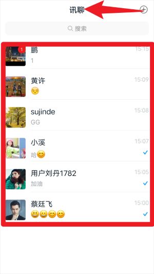 4、进入“讯聊”功能后,可快速查看聊天联系人列表,点击右上角“+”图标可发起新的聊天。