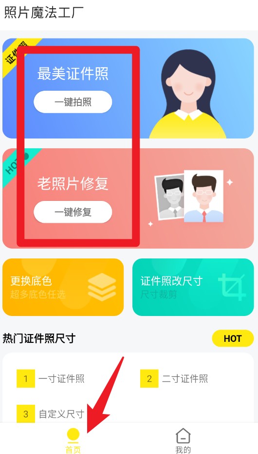 1、首页功能区展示证件照与老照片修复功能支持一键拍照或一键修复,用户可快速生成精美证件照或修复模糊、褪色的旧照片,操作非常简便。