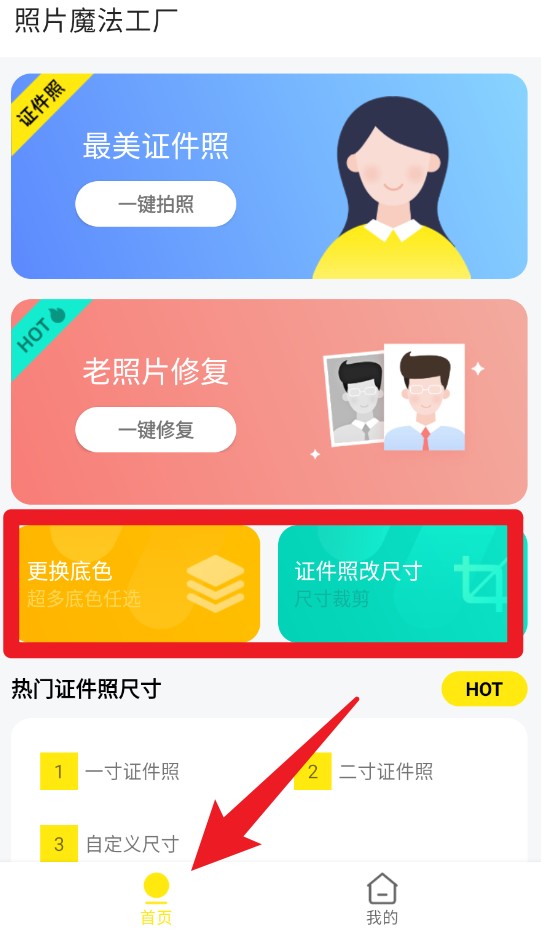 2、首页功能区同时提供更换底色和证件照改尺寸工具,方便用户灵活编辑照片。