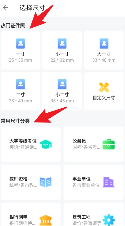 3、选择尺寸界面中可挑选常见的一寸、小一寸、大一寸、二寸、小二寸等热门证件照规格,并支持自定义尺寸以满足特殊需求。