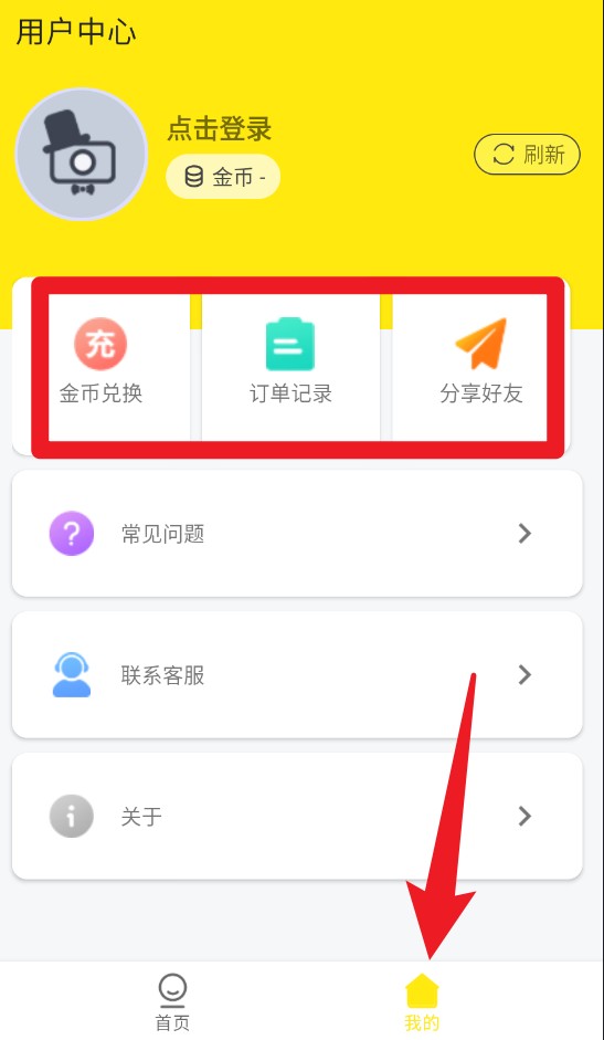 4、用户中心界面提供金币兑换、订单记录与分享好友三大功能入口,便于用户快速进行充值、查看历史订单以及邀请好友获取奖励。