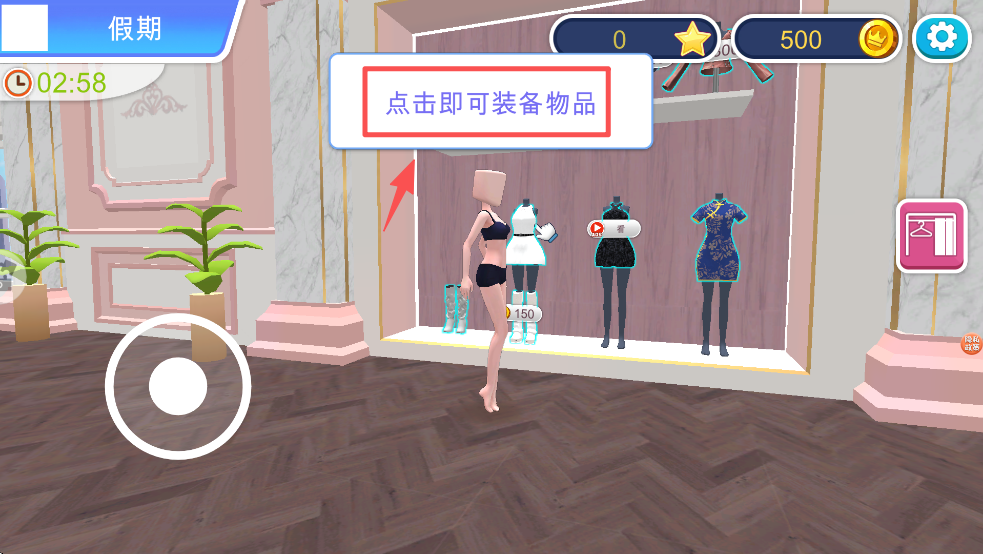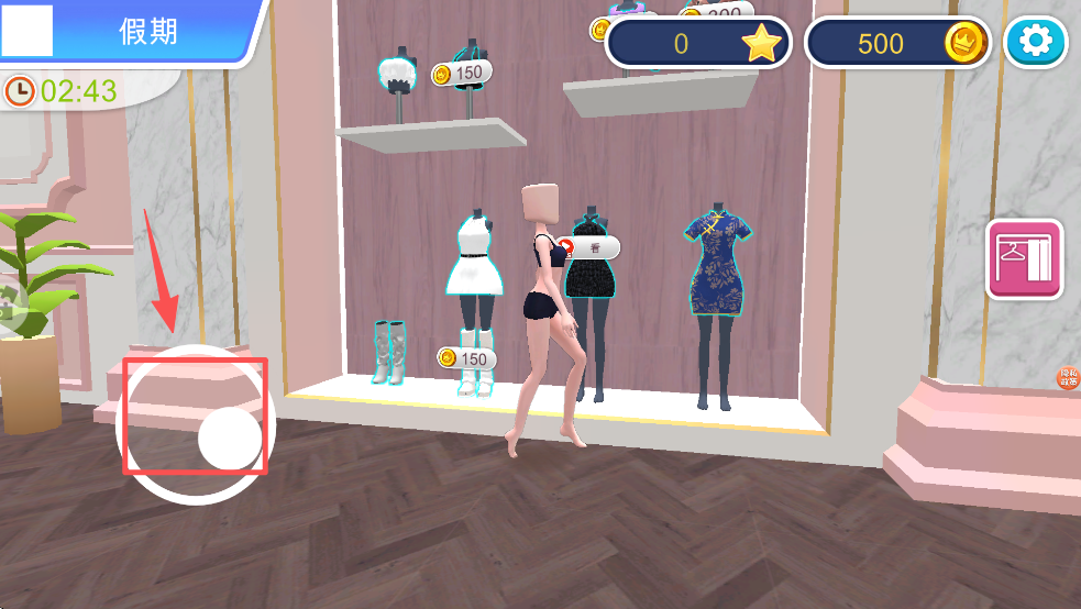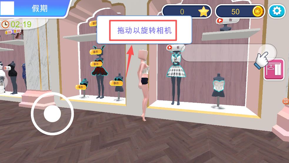 3、使用虚拟摇杆控制角色移动,靠近展示台,查看更多服装选项。