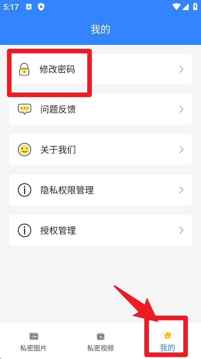 5. 点击底部导航栏的 “我的” 标签,进入个人设置页面,可修改密码、管理隐私权限等。