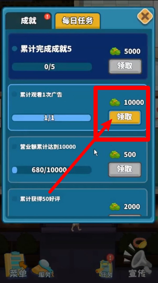 1.任务奖励:每日任务和成就可获得金币奖励,点击领取按钮即可快速获取资金,用于扩建设施和提升经营效率。