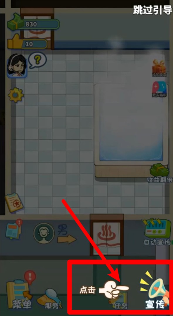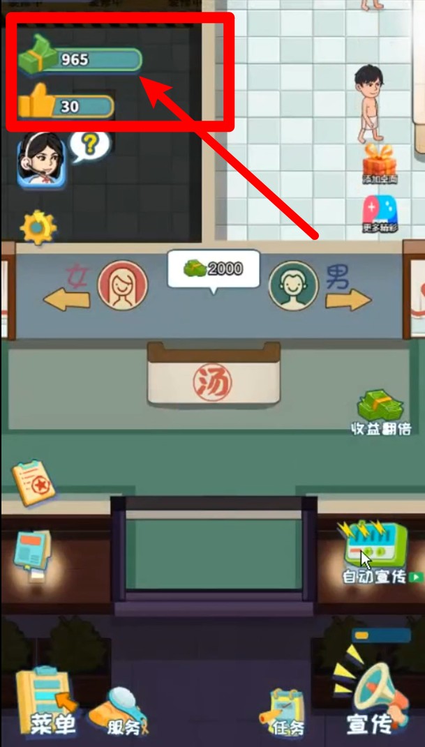 3.宣传功能:点击界面右下方的宣传按钮可进行推广活动,吸引更多顾客进店消费,提高人气并加快洗浴城的发展速度。