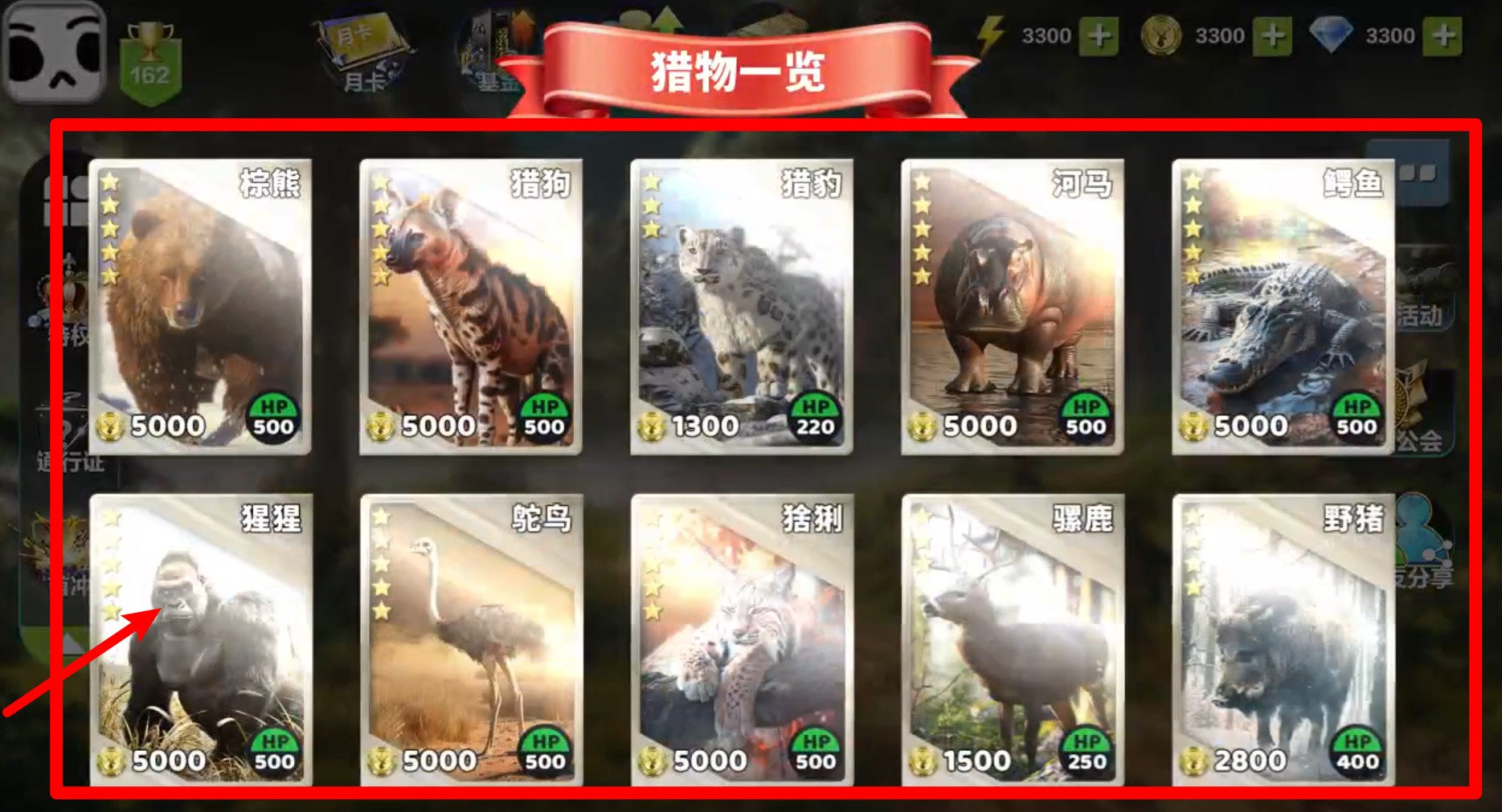 2.猎物图鉴:在猎物一览中可查看多种动物信息,包括熊、河马、鳄鱼等,每个猎物都有星级与生命值,增加了挑战多样性。