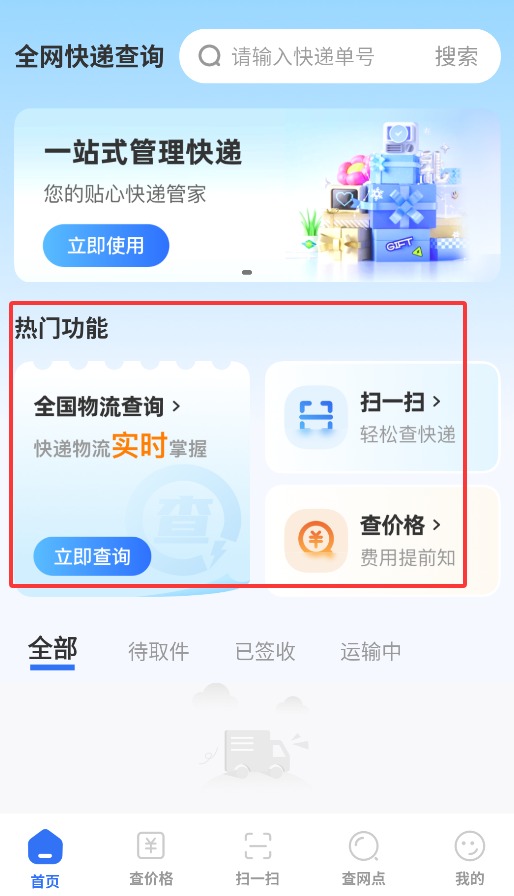 2、在首页功能区,可使用热门服务、全国物流查询、扫码查件或价格估算等。