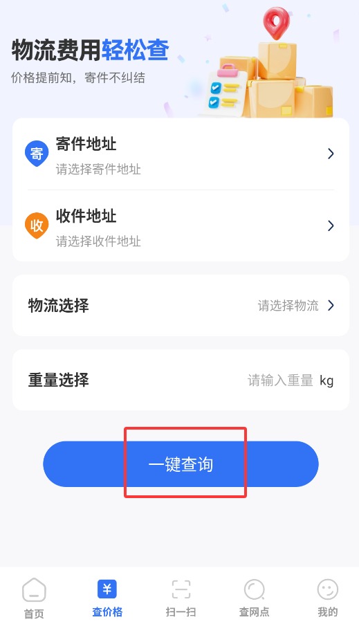 3、通过价格查询板块,输入寄收地址及物品重量后即可一键生成运费结果。