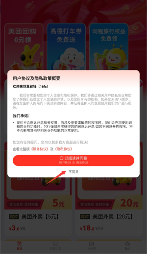 1、初次启动应用时,需阅读并同意用户服务协议及隐私条款,点击确认后进入主界面。