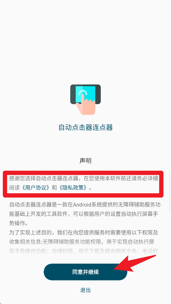 1、首次打开【自动点击器连点器】,请仔细阅读《用户协议》和《隐私政策》,然后点击“同意并继续”。