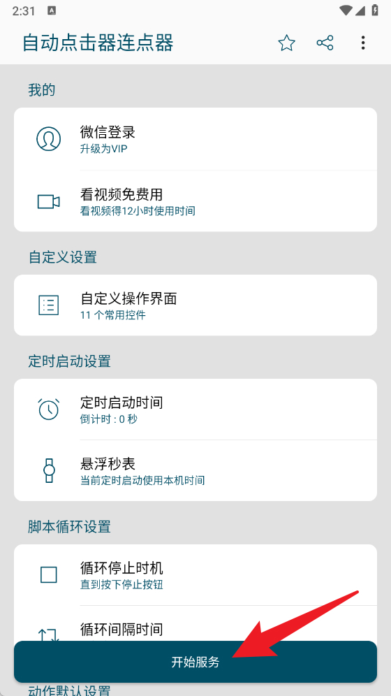 2、进入主界面,点击【开始服务】,即可开启自动点击功能。