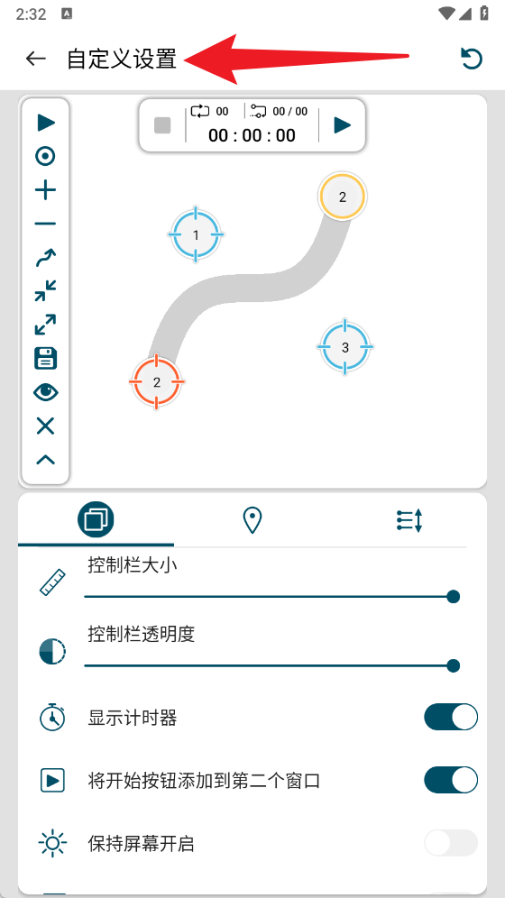 3、在【自定义设置】中,可添加点击点、调整控制栏大小与透明度,并设置保持屏幕常亮。