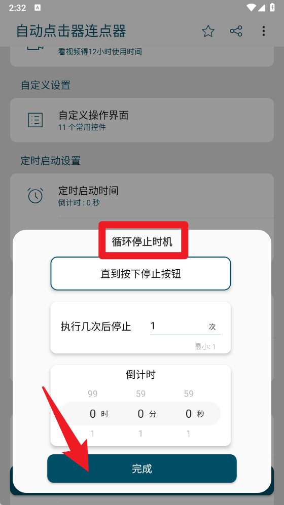 5、在【循环停止时机】中,可设置点击执行的次数或倒计时,到达条件后自动停止。
