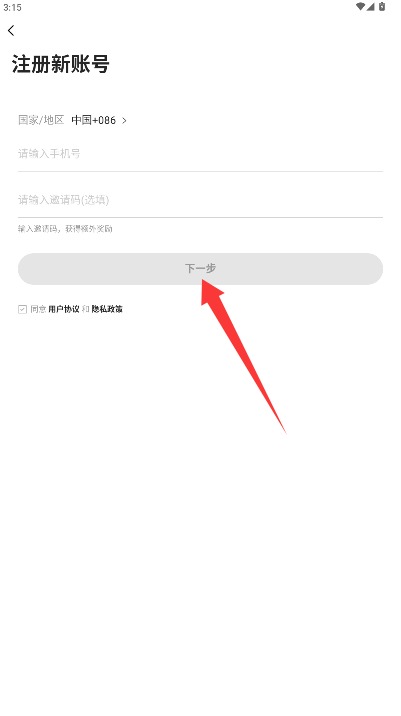 3、在注册界面输入手机号和邀请码(选填),勾选同意相关协议后点击下一步。