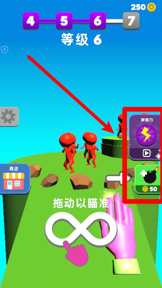 3.能力解锁:关卡中可选择新能力或消耗金币购买炸弹道具,前者能提升角色实力,后者可在关键时刻大范围清理敌人。