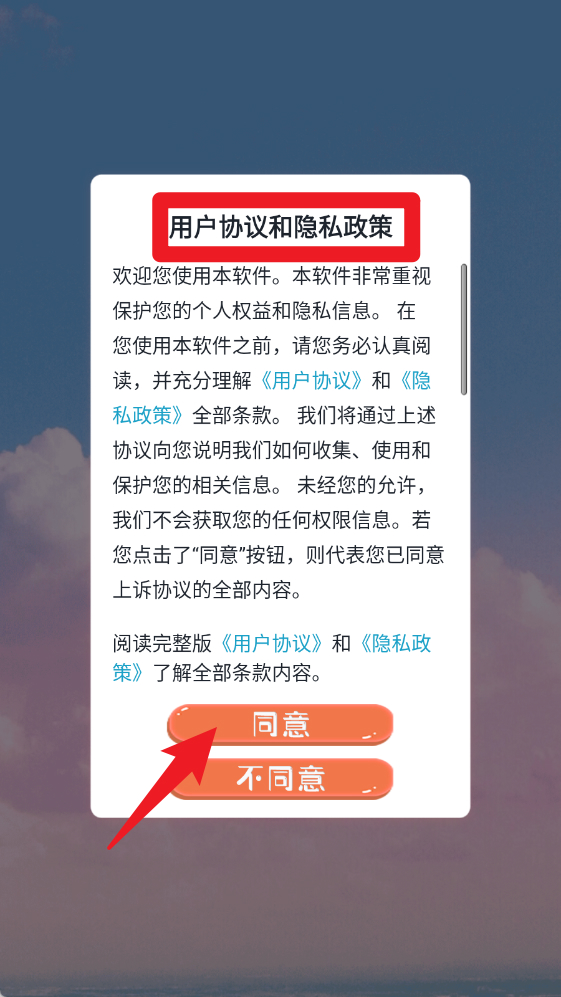 1、首次打开【姨妈月经期管家】,会弹出用户协议与隐私政策,请仔细阅读并点击“同意”以继续使用。