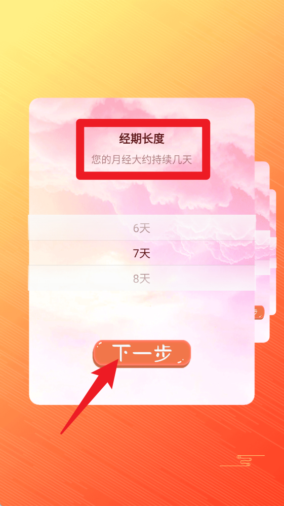 2、根据提示填写【经期长度】,选择月经大约持续的天数后点击“下一步”。